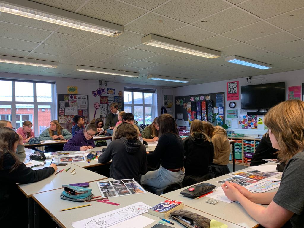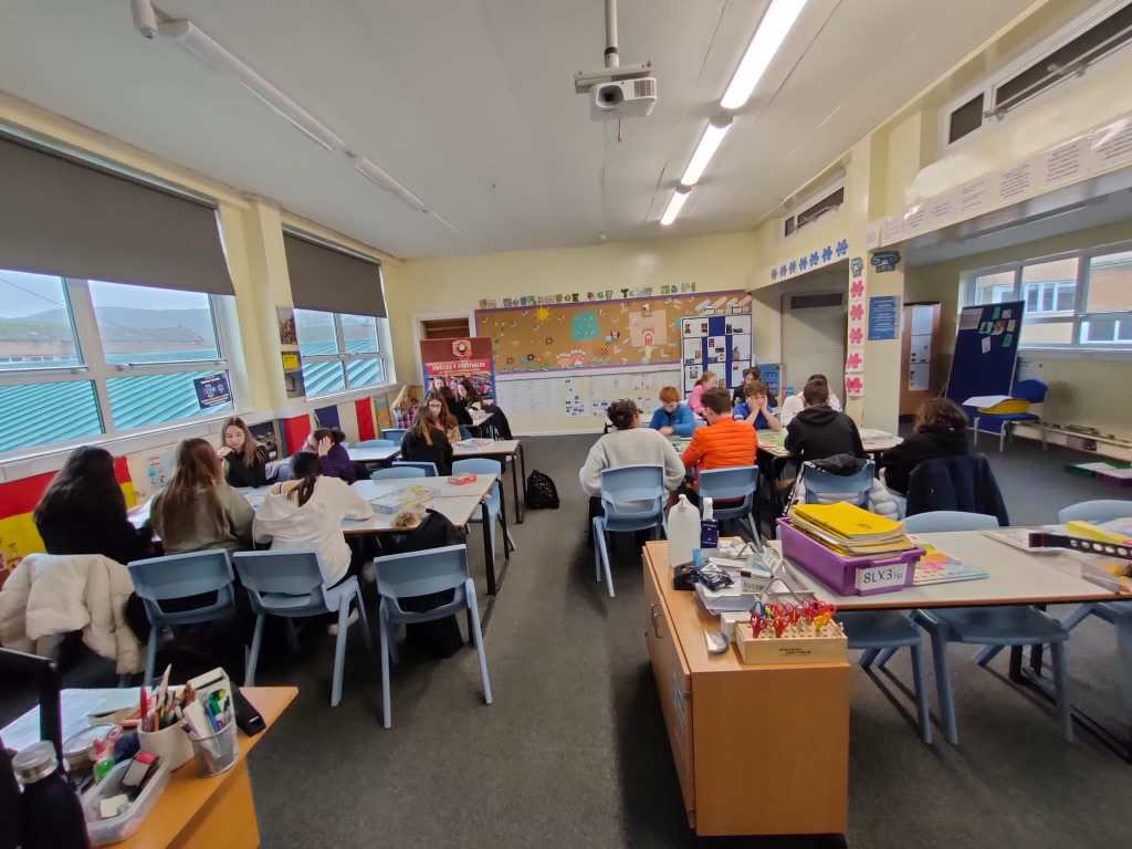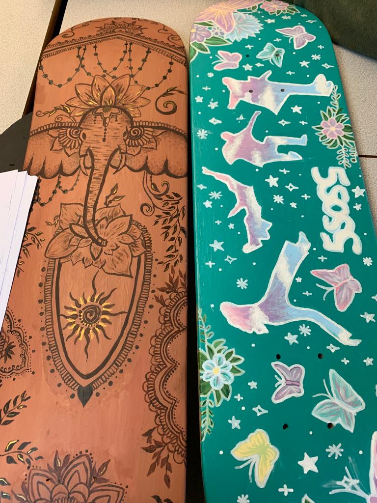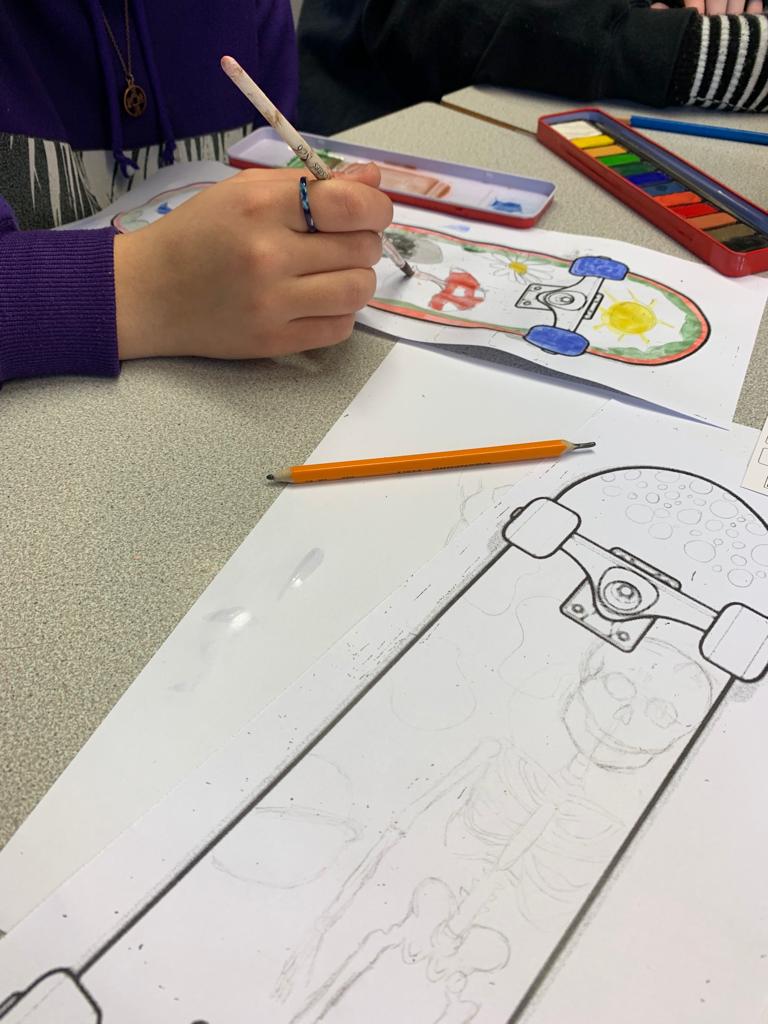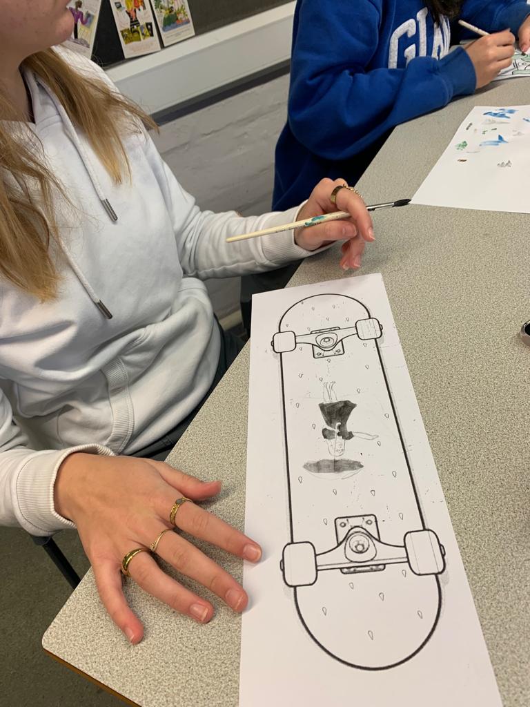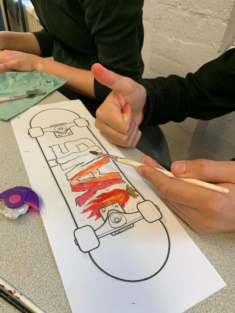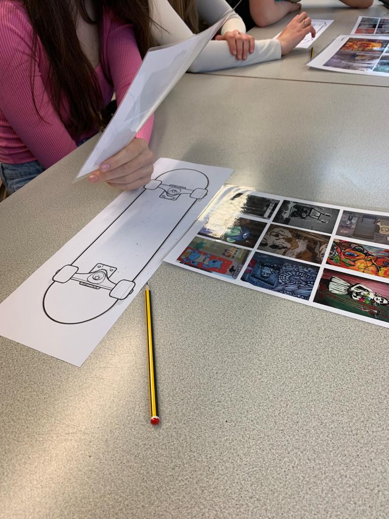 So everyone met at school this morning to start the day the creative way! Carrying on from yesterday’s Street Art day, all the pupils were invited to design a template for a skateboard. They worked in pairs or alone to customise their skateboard template.