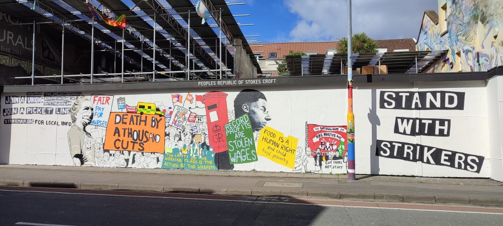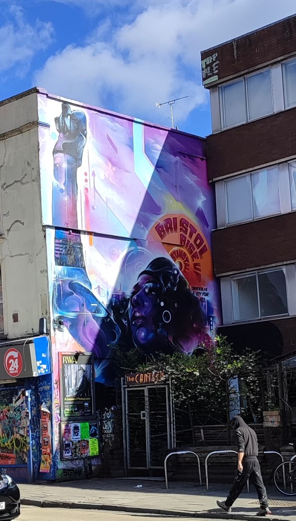 Today we were in Bristol, the city reputed to be the birthplace of the famous street artist: Banksy. The city is located on the Avon river, the gateway to the Atlantic Ocean. It’s a large, vibrant, diverse university city.