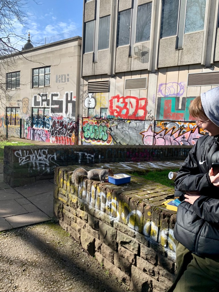 We had lunch in a park by the river and in the sunshine. A grey squirrel joined us and stole some of Charles’ lunch!