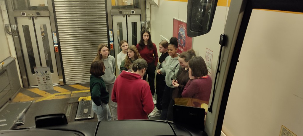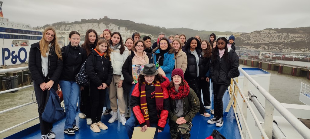 We arrived at the port of Dover at 1:45 pm UK time. From the deck we could see England from afar. The water was green. There were lots of gulls and a lot of wind. We are writing this at 3:36 pm in England in the bus. We started to complete our trip booklet « My school exchange with Malvern ».